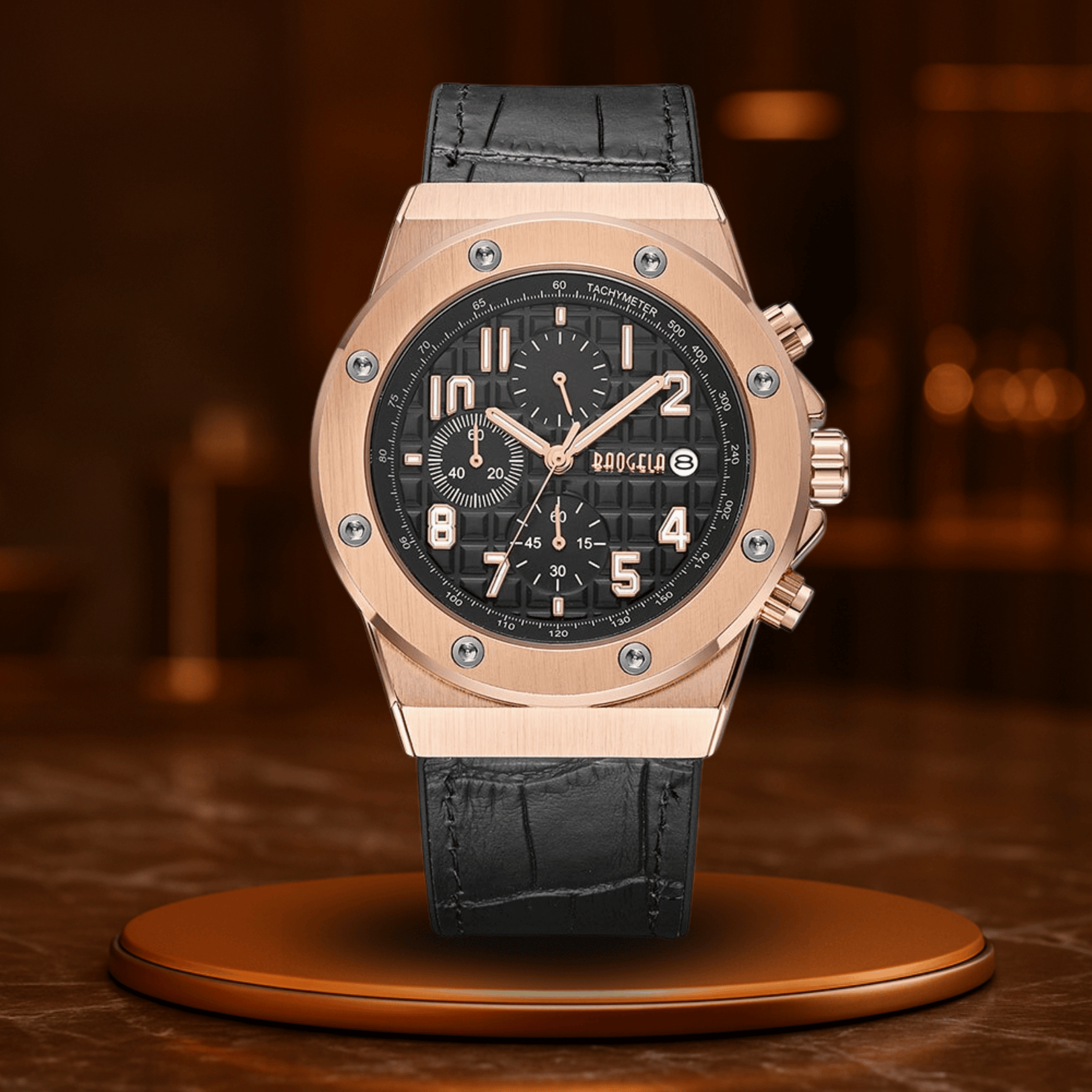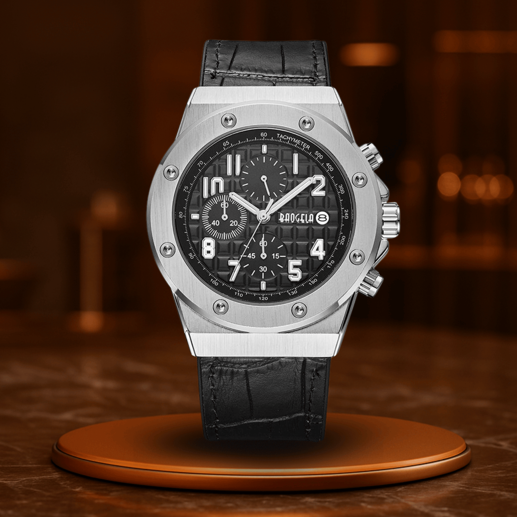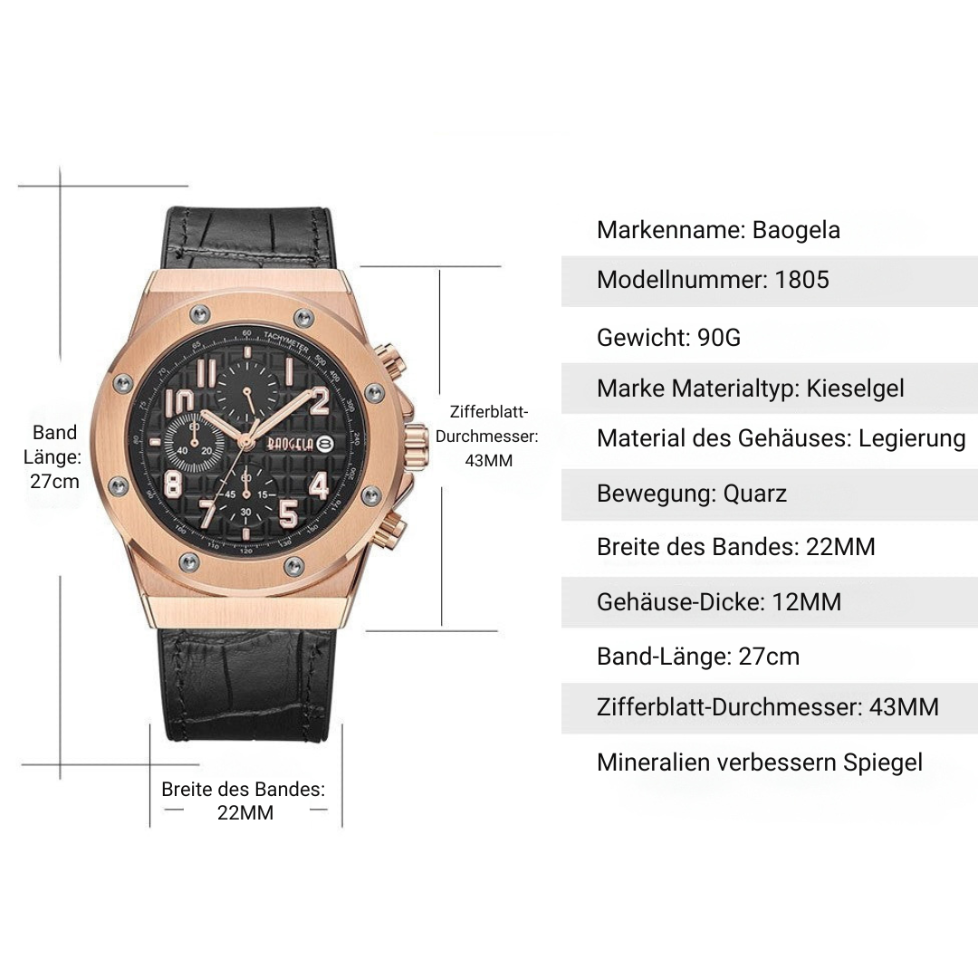 The genuine leather strap ensures a comfortable wearing experience while exuding confidence. Luminous hands, chronograph function, and a reliable quartz movement complete the technical interior – ready to reach any goal with style.