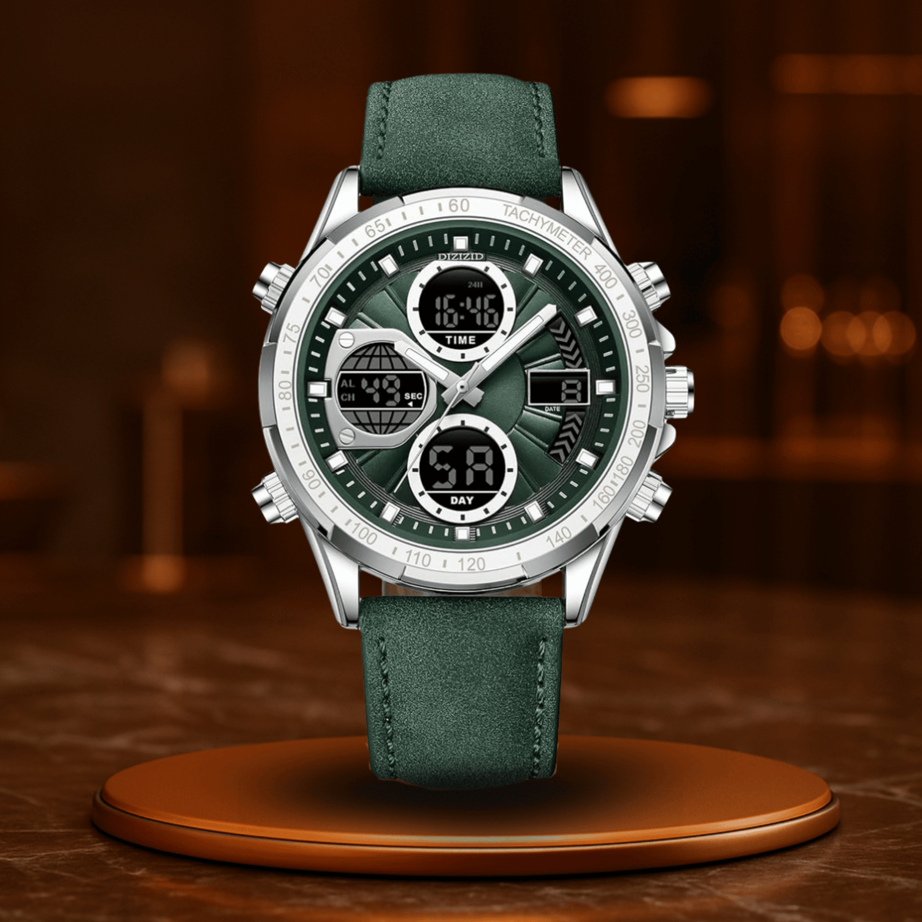 L’Officier – Green Military Edition by Élan Tactique is not just a watch – it is a testament to precision, steadfastness, and character. Inspired by tactical gear and designed for urban use, this watch combines a rugged green leather strap, a shock-resistant case, and a precise quartz movement that won’t let you down, even when the day does.